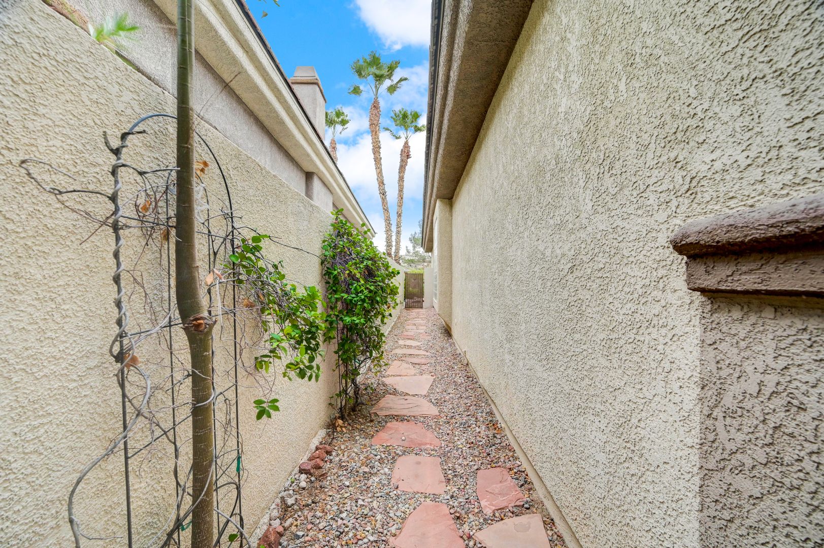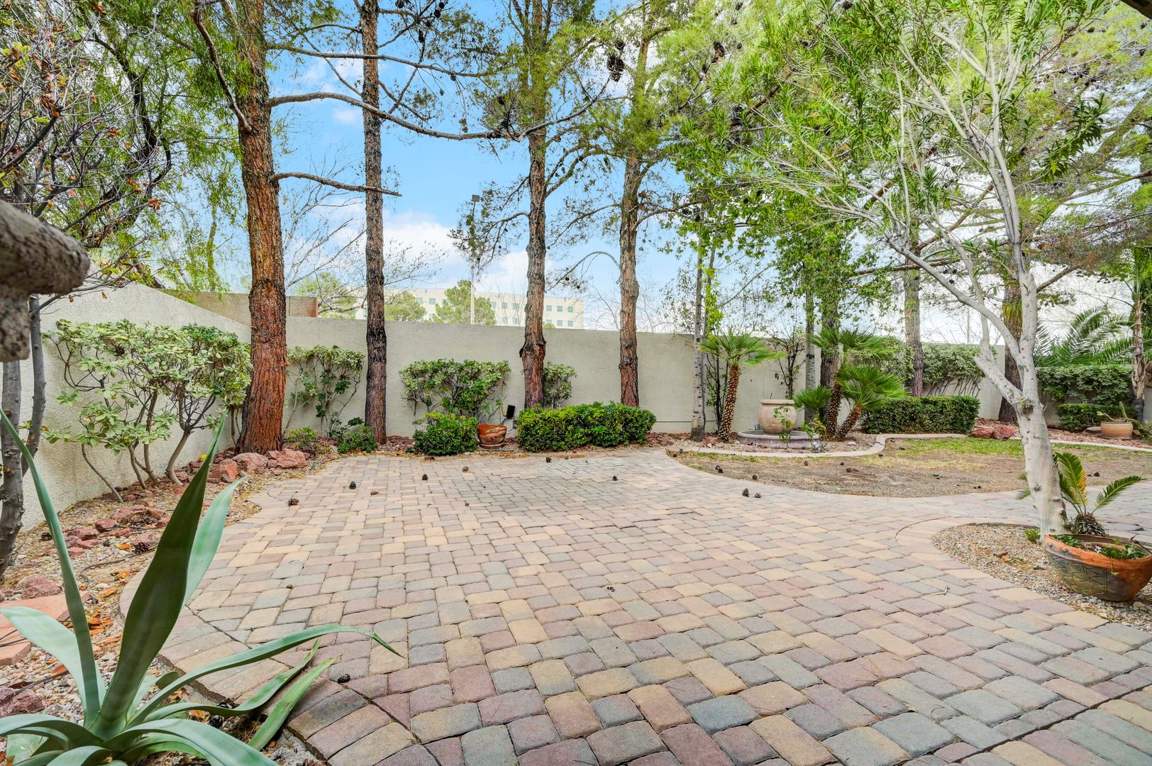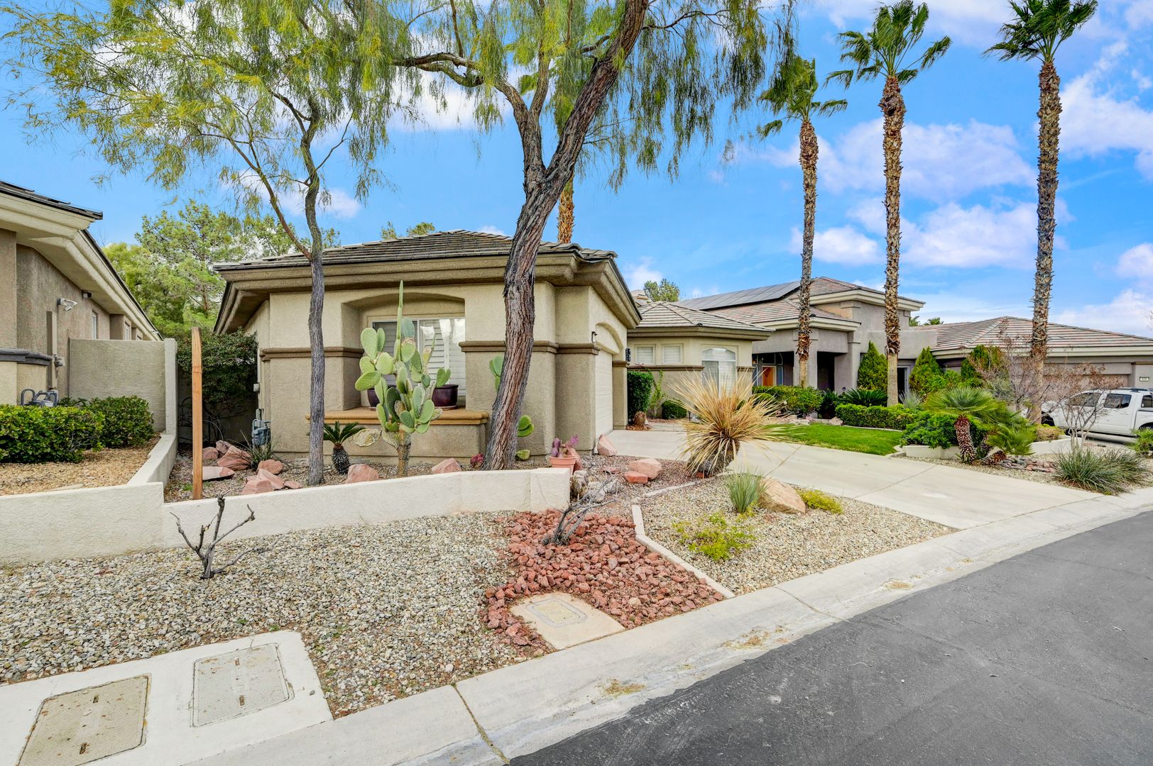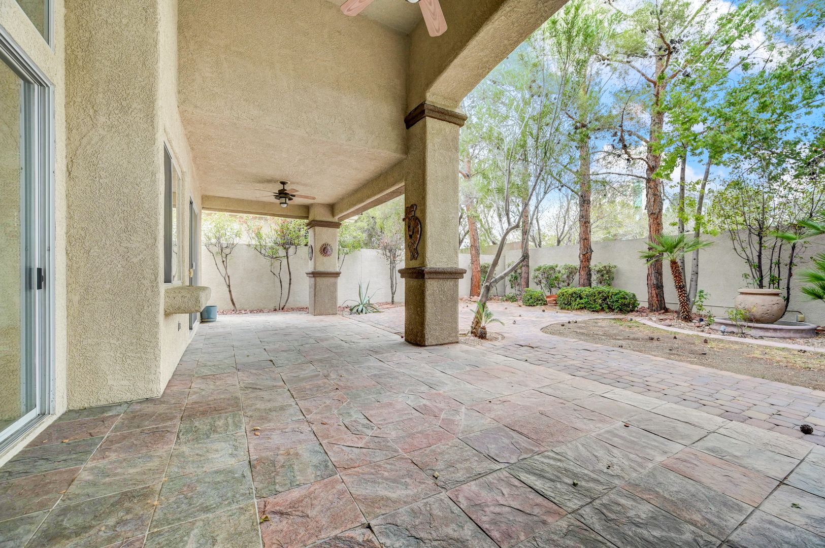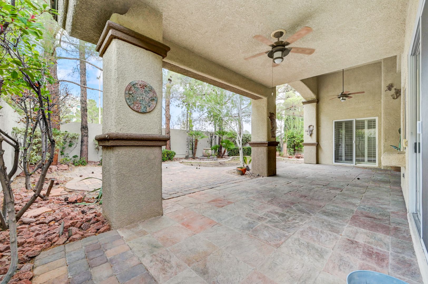 Unbeatable value in Summerlin! Located in the gated Canyon Ridge community next to TPC Summerlin, this single-story home features a spacious great room with gas fireplace, vaulted ceilings, and no carpet throughout. The gourmet kitchen offers a large granite island, walk-in pantry, pull-out drawers, wine rack, and Viking stainless steel appliances with double ovens. Private primary bedroom with oversized jetted tub, walk-in shower, and organized closet. Third bedroom set up as an office. Shutters throughout. Enjoy a pool-sized backyard with covered patio and tranquil fountain. Close to Downtown Summerlin, Red Rock Canyon, Summerlin Hospital Medical Center, Boca Park, and the Las Vegas Beltway. The price includes $50 a month for Trash & Sewer.