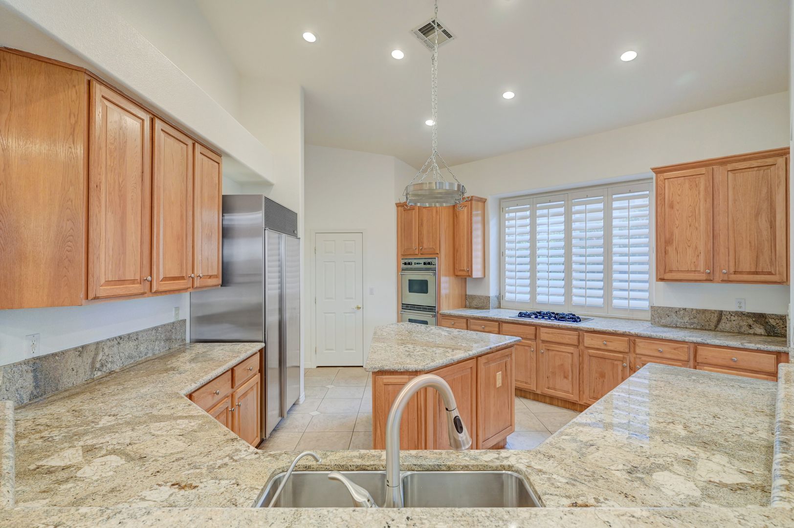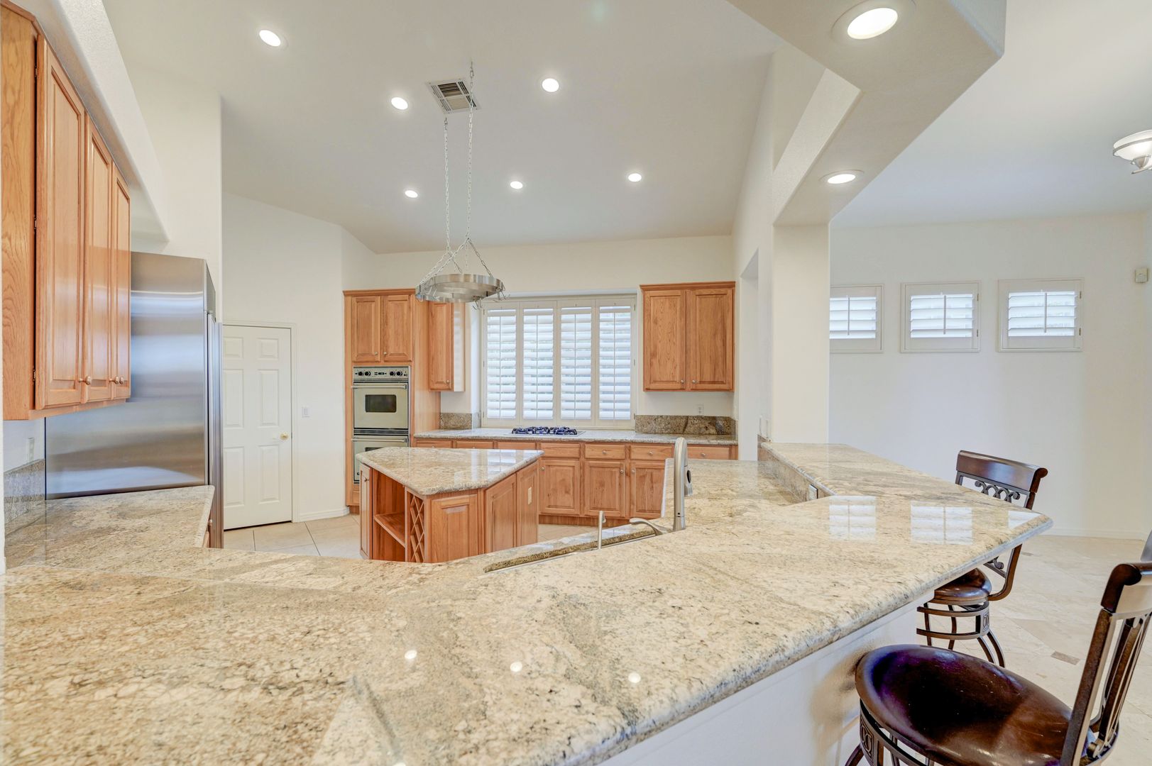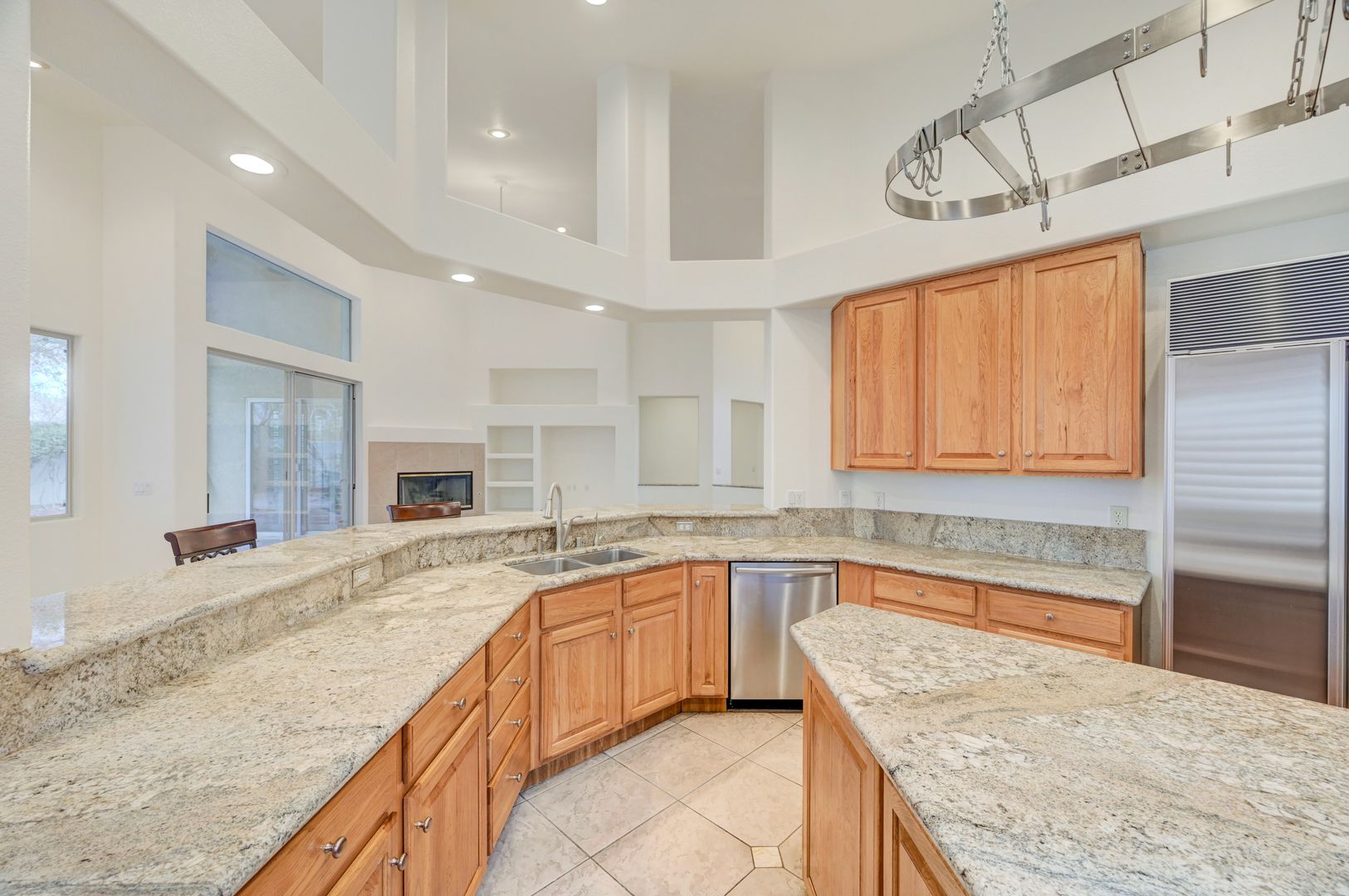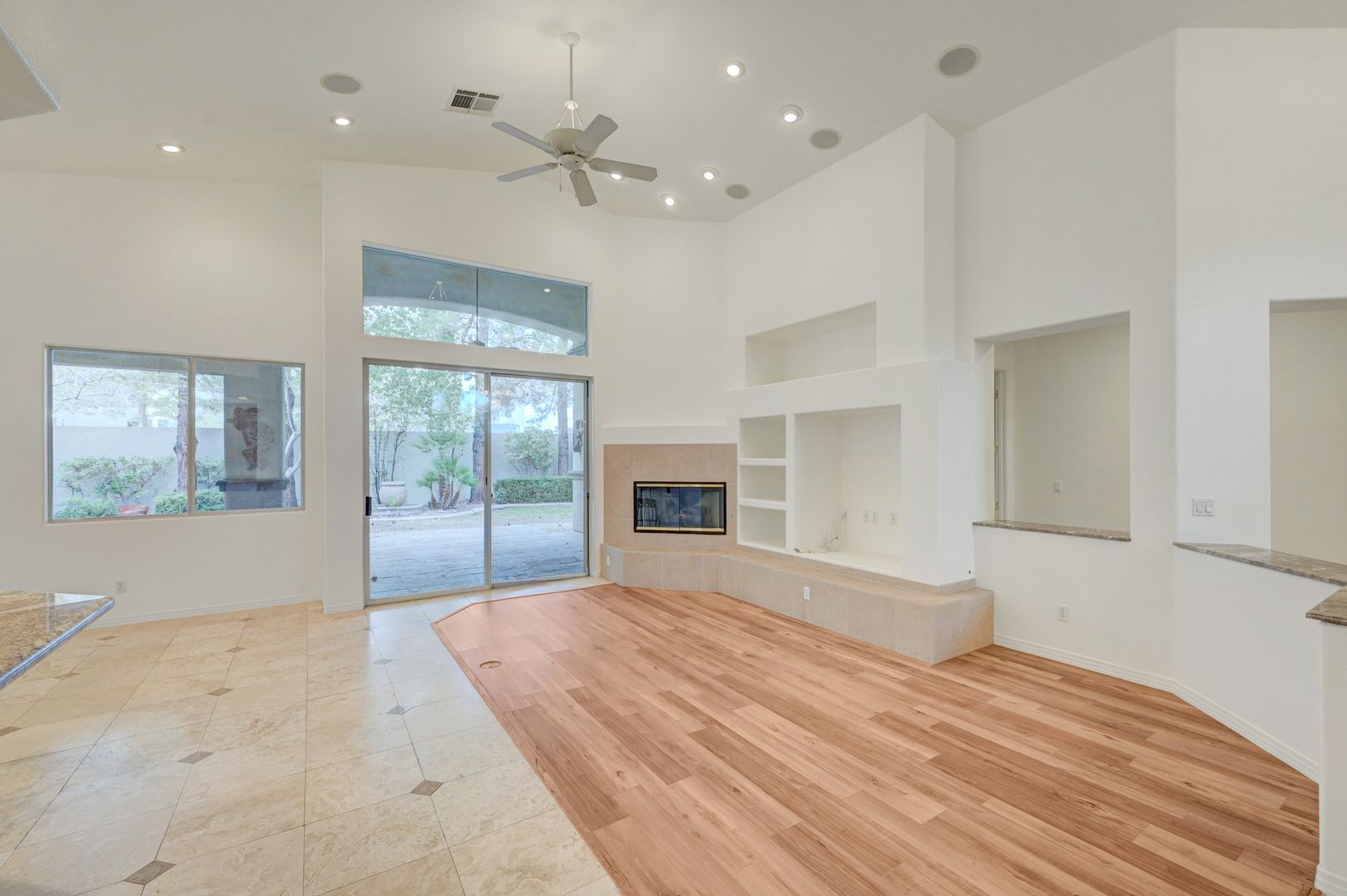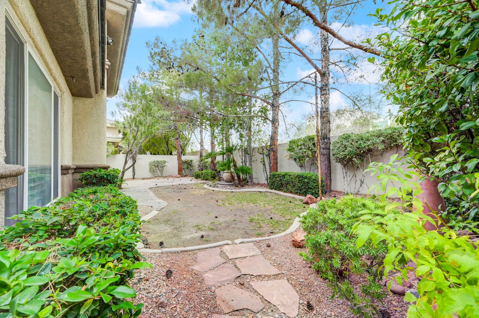 Unbeatable value in Summerlin! Located in the gated Canyon Ridge community next to TPC Summerlin, this single-story home features a spacious great room with gas fireplace, vaulted ceilings, and no carpet throughout. The gourmet kitchen offers a large granite island, walk-in pantry, pull-out drawers, wine rack, and Viking stainless steel appliances with double ovens. Private primary bedroom with oversized jetted tub, walk-in shower, and organized closet. Third bedroom set up as an office. Shutters throughout. Enjoy a pool-sized backyard with covered patio and tranquil fountain. Close to Downtown Summerlin, Red Rock Canyon, Summerlin Hospital Medical Center, Boca Park, and the Las Vegas Beltway. The price includes $50 a month for Trash & Sewer.