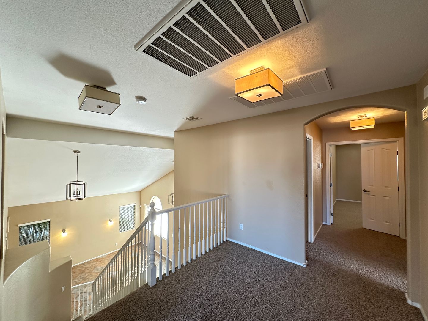 Attractive and spacious 5 bed, 3.5 bath home in desirable Summerlin featuring an open floor plan with vaulted ceilings and tile/carpet throughout. Downstairs includes separate living room, family room, and den. Kitchen offers stainless steel appliances, walk-in pantry, and breakfast bar/island. Primary suite includes double sinks, soaking tub, walk-in shower, and balcony access with great views. Upstairs loft provides additional living or office space. Large backyard with with mature landscaping that also includes a covered patio. Price includes $50 a month for trash and sewer.